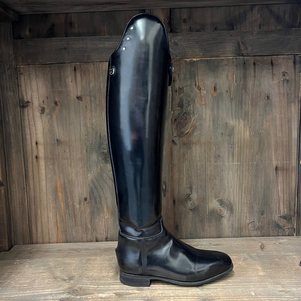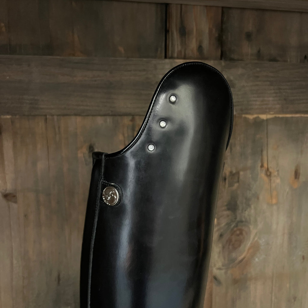 Lightly worn Passage Boots. Hand Polished Black with 3 hand placed silver crystals. These also have a sheepskin lining in the foot.
