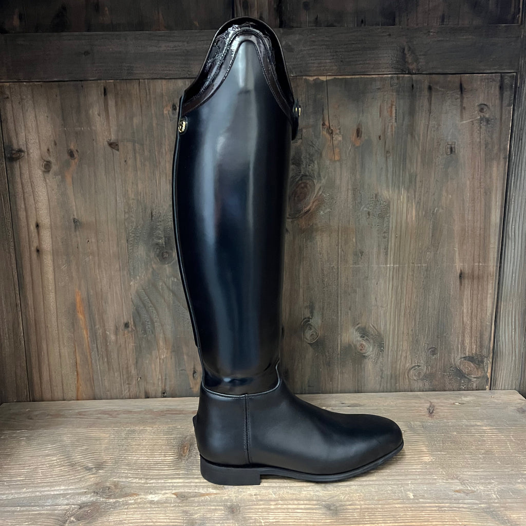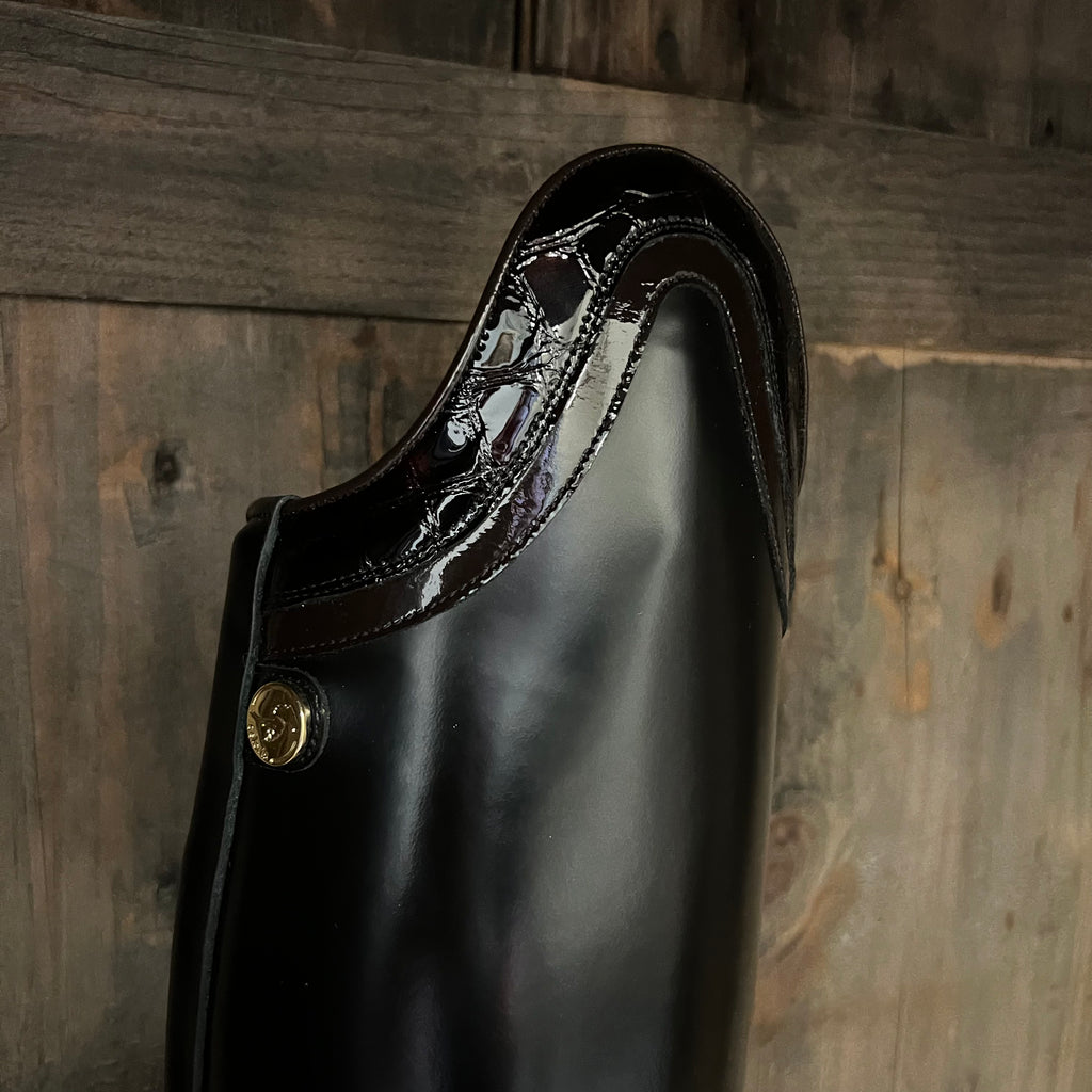 Amazing brand new and unworn Passage Compete boots in Hand Polished Black with Chocolate Faux Croc Gloss and Chocolate Gloss detailing on the top with a short strap and popper. With a Matte Black Foot.