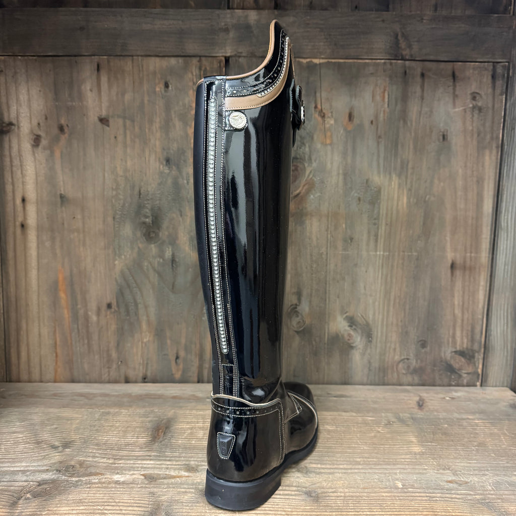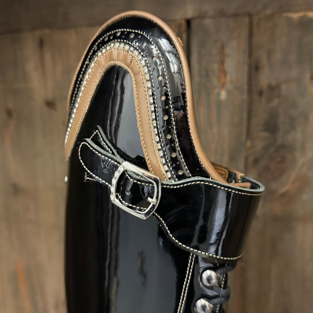 Brand new Bia in black gloss with taupe and crystals accents. This gorgeous boot also has a crystal spine and contrast stitching.