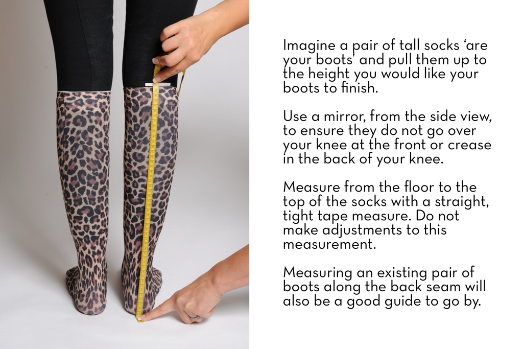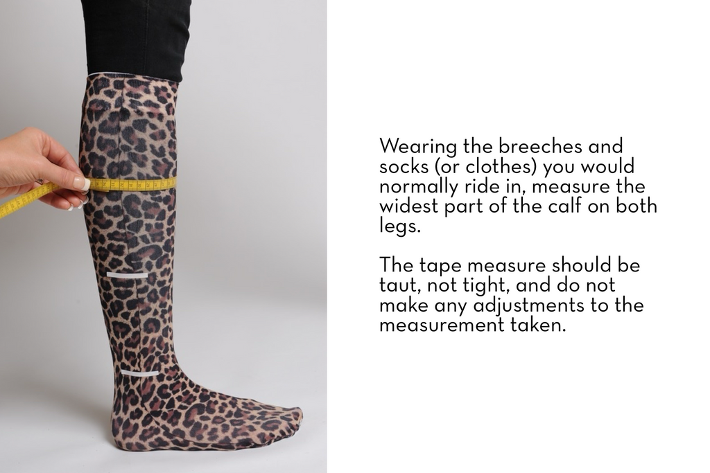 Always have someone else take your measurements and makes sure you are standing when measuring the calf and height for accuracy. Wear your regular breeches and socks and follow the fit guide below for the very best fit for you.