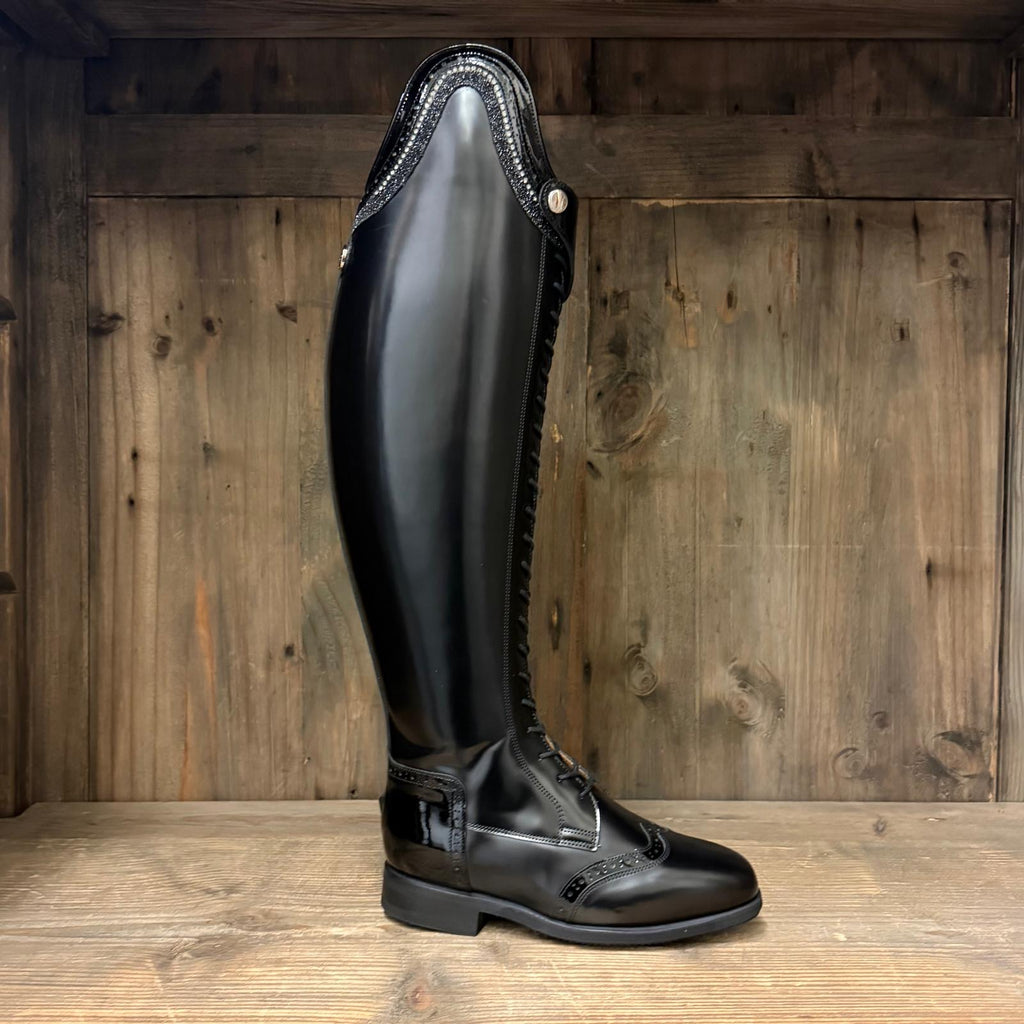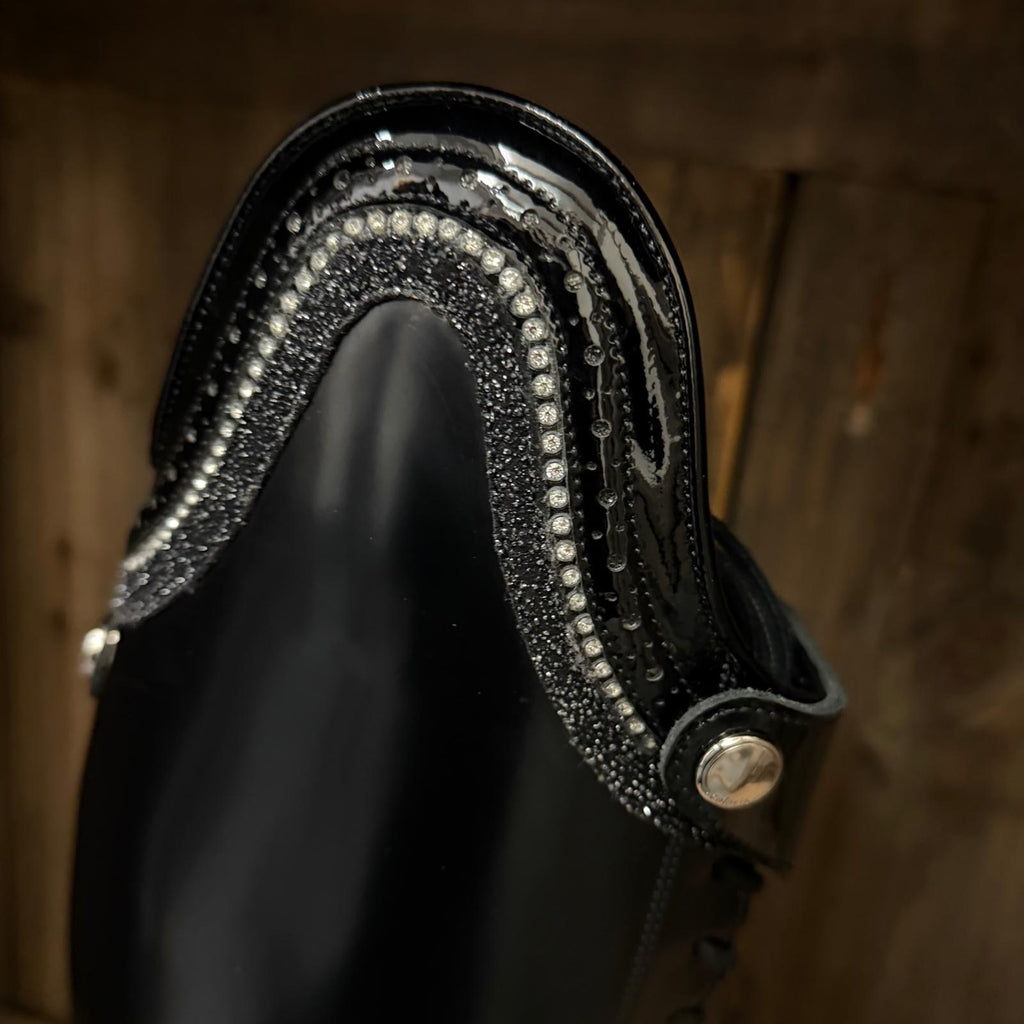 Brand New Bia Compete boots in Hand Polished Black with Black Gloss accents. Including a custom top style 10 with Black gloss brogue feature, a row of silver crystals and black shimmer. Long strap and Popper in Black Gloss along with Matte Black inside panel, these have not been ridden in.