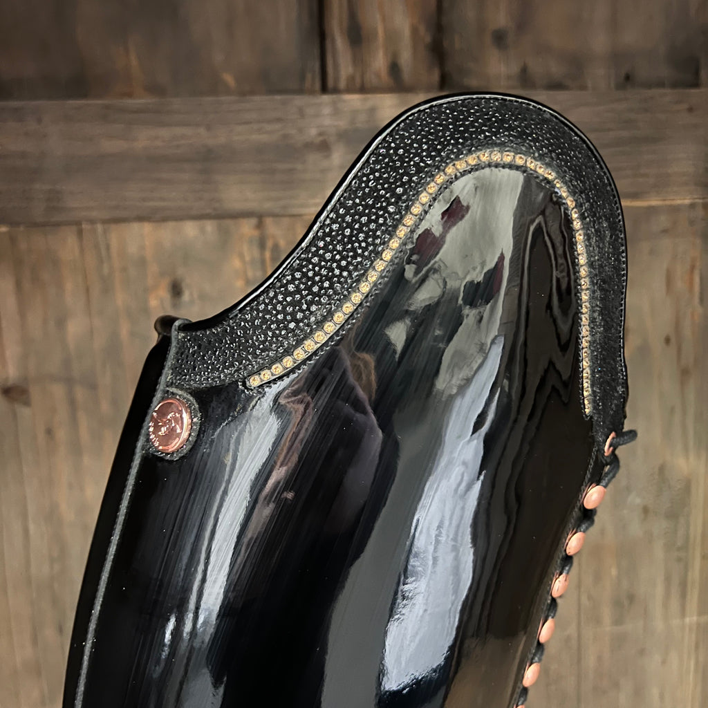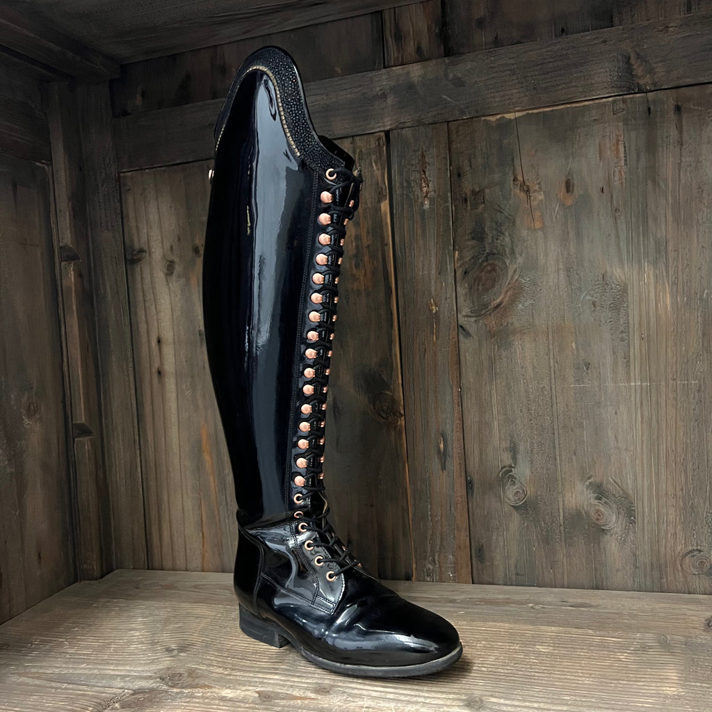 Lightly broken in Bia boots in Black Gloss with Black Swarovski Top and rose gold crystals.
