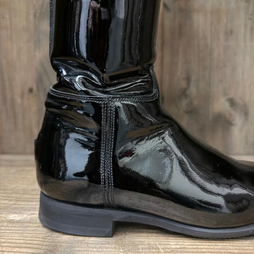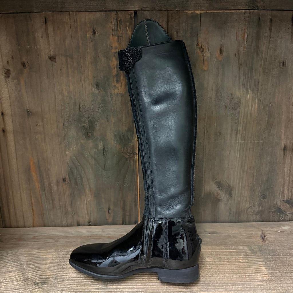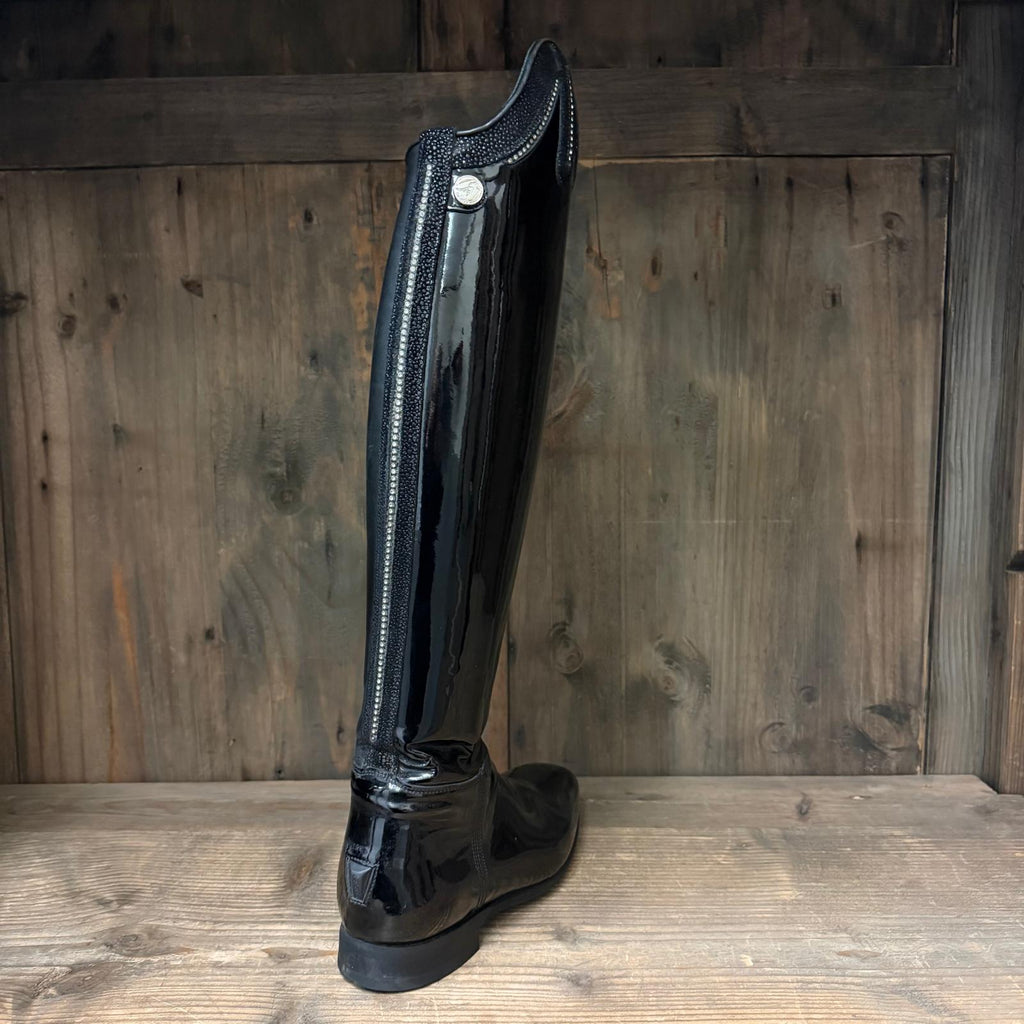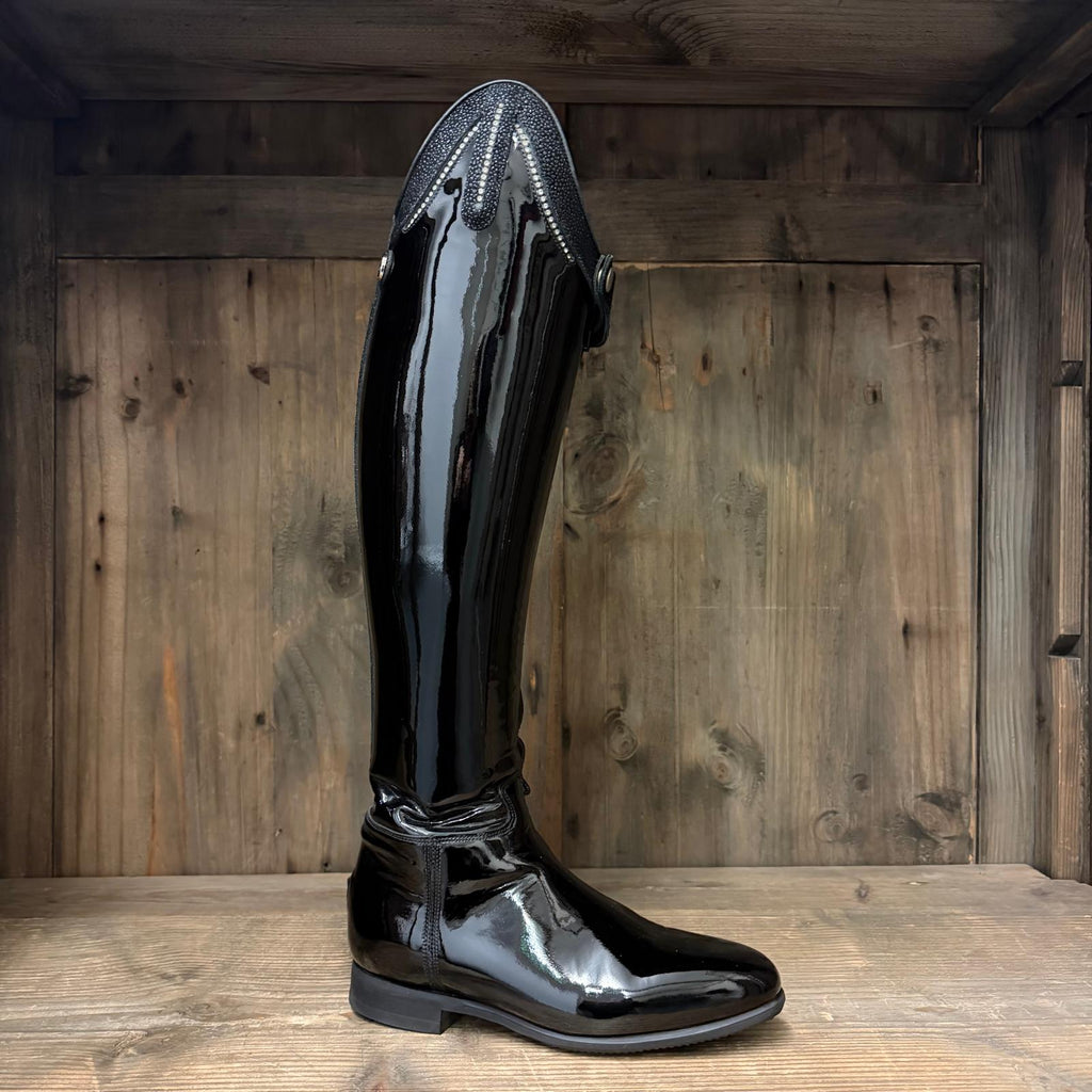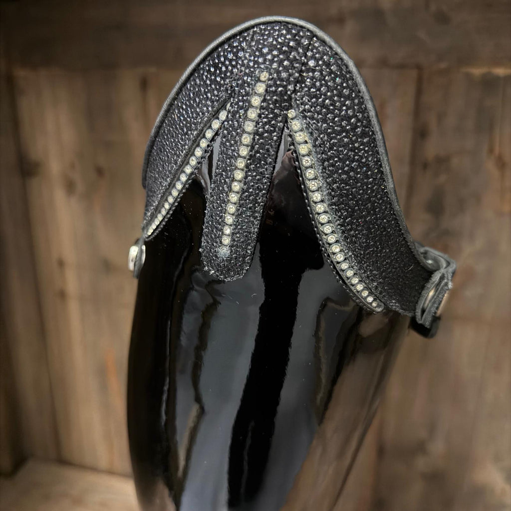 Barely worn Passage boots in Black Gloss with Matte Black inside panel. Top Style 13 with Black Swarovski and Silver Crystals. As well as a black Swarovski and silver crystal spine.